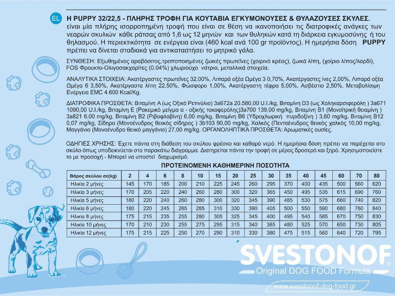 Πλήρης τροφή για κουτάβια, έγκυες και θηλάζουσες σκύλες SVESTONOF H Puppy 32/22,5